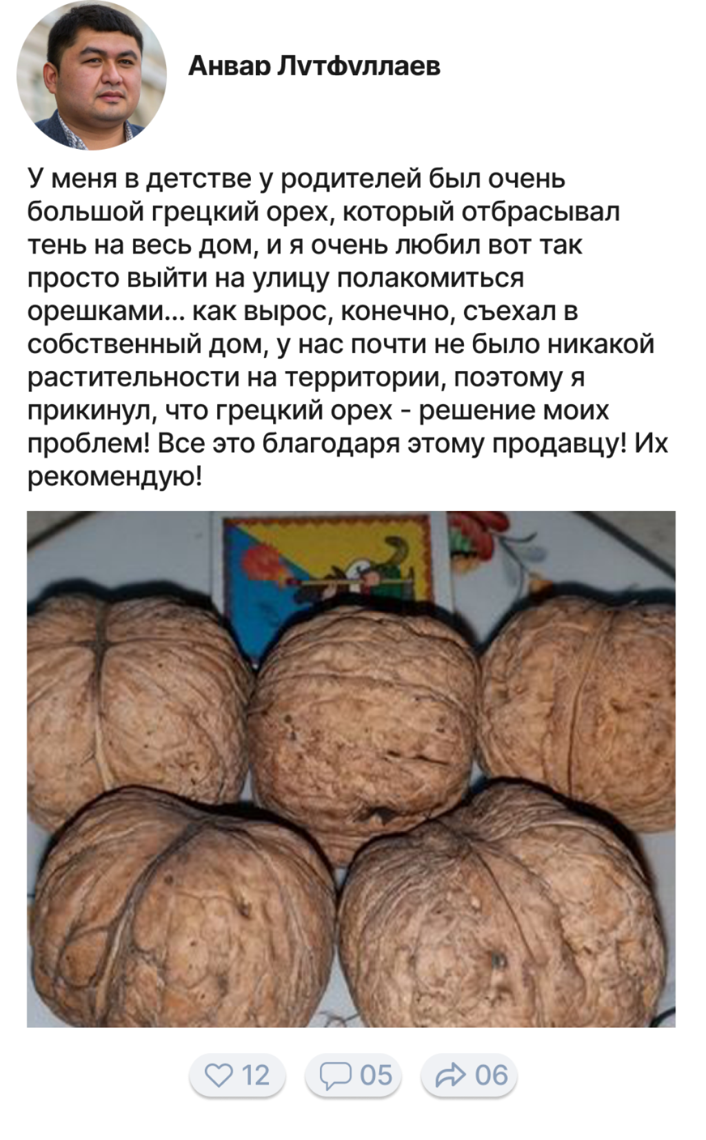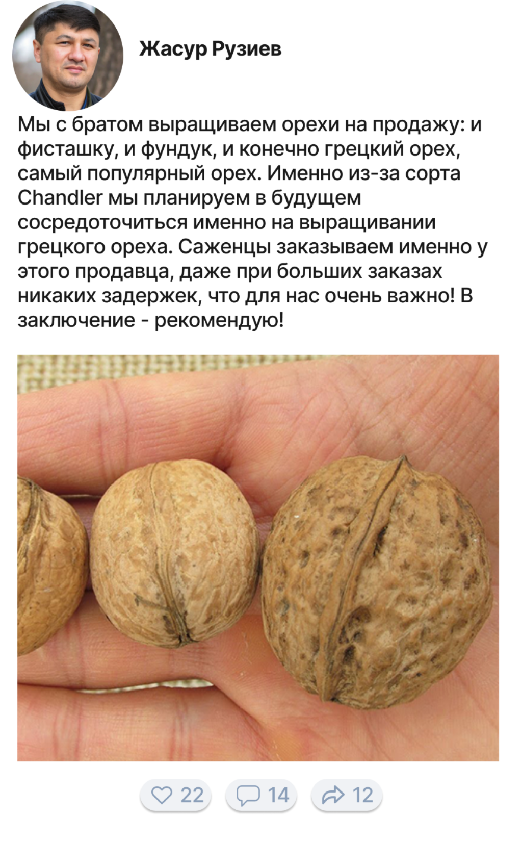 Грецкий орех — очень ценный вид дерева, и мы часто не понимаем, что растет у нас под ногами, каким богатством мы обладаем. Грецкий орех очень часто используют в производстве дорогой мебели, орех имеет очень красивый цвет и структуру дерева. Я с семьей выращиваю орехи на продажу уже более 20 лет. 5 лет назад мы начали продавать ореховые саженцы нашим клиентам и каждый раз радуемся, когда им удается вырастить собственные ореховые сады!