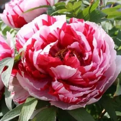 Пион встречается также под названием Красно-Белый. Обладает достаточно компактными размерами, имеет крепкие густо облиственные стебли.